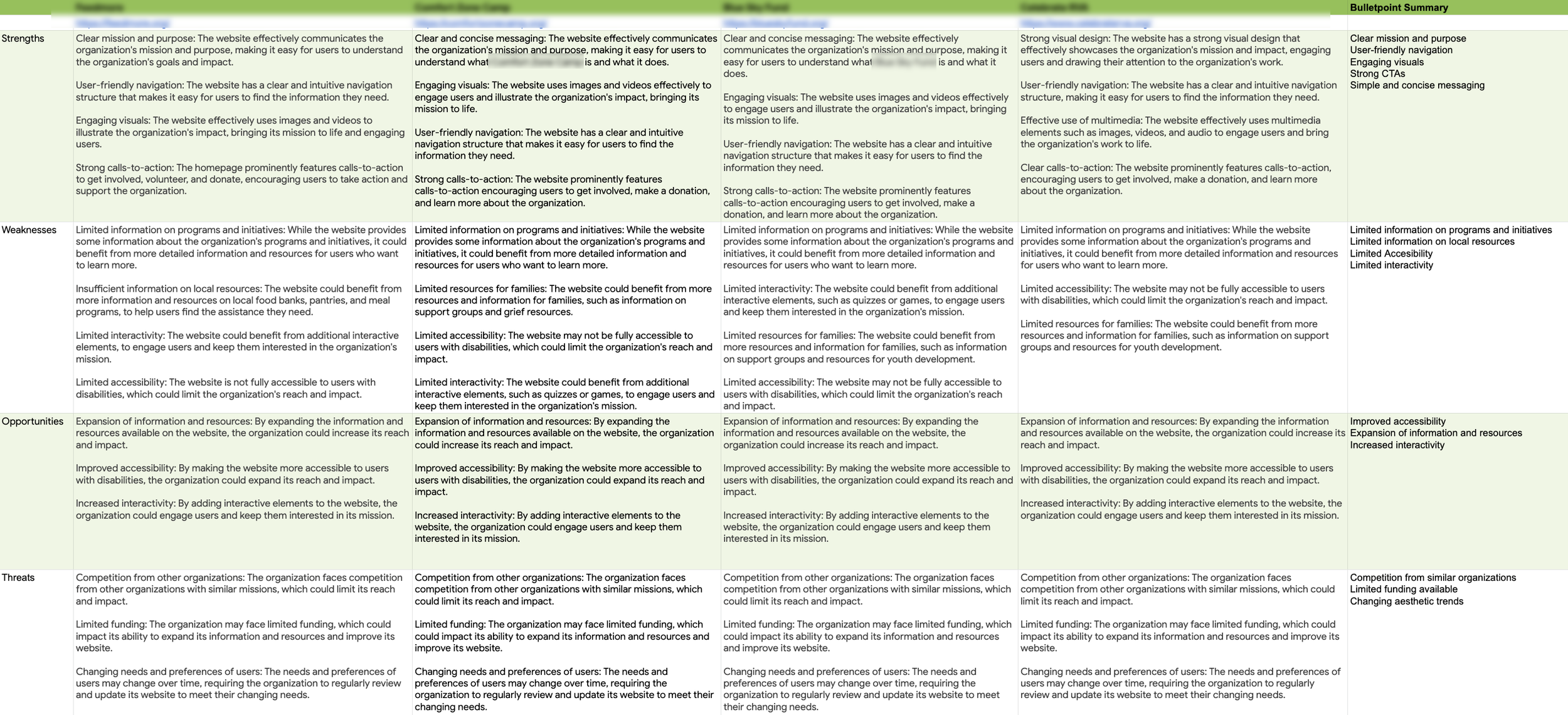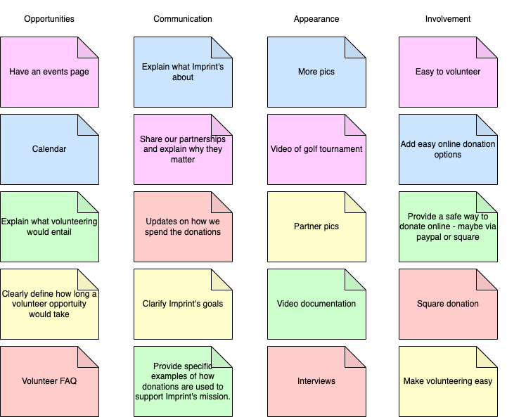 I requested the help of the Imprint nonprofit board when selecting a set of competitors for a SWOT analysis. Together, we chose four organizations similar in size, mission, and target audience. These three key similarities would ensure our findings would be more useful and applicable to Imprint’s website.