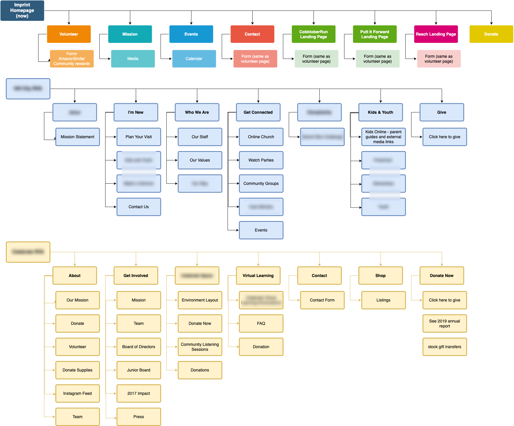 We mapped Imprint’s old sitemap as well as the sitemap of two competitors to compare how different nonprofits handle their website’s information architecture.