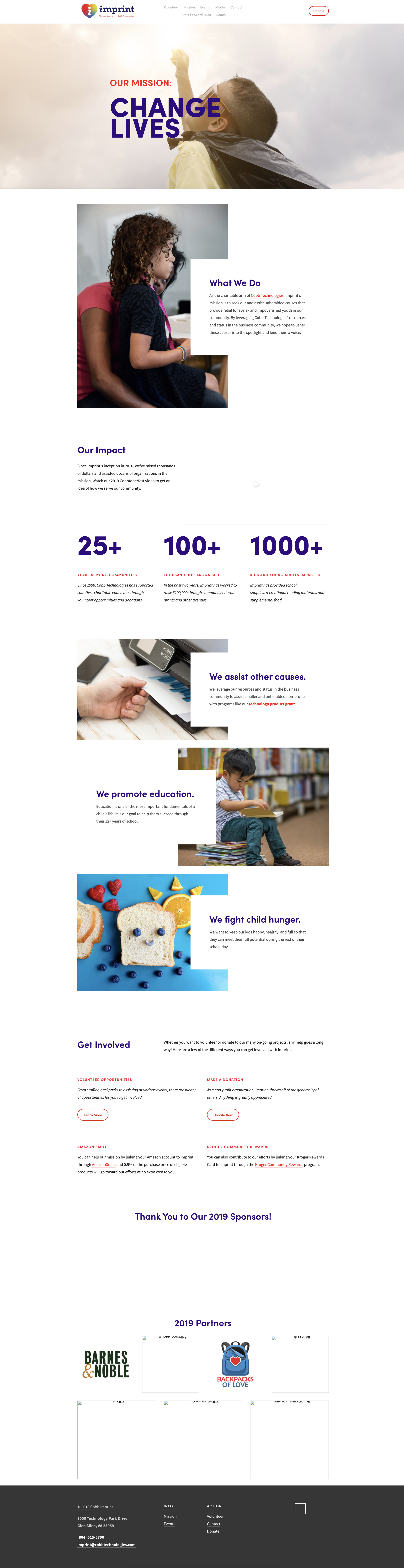 Imprint is the 501c3 charitable arm of Cobb Technologies. Imprint's mission is to extend financial support, manpower, and exposure to causes that provide relief to underprivileged and at-risk youth in Virginia.